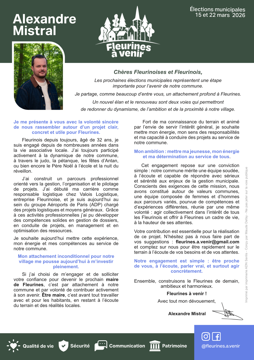 Cette équipe est composée de membres engagés, avec des compétences complémentaires, qui nous permettront de mettre en œuvre le programme ambitieux, innovant et résolument ancré dans le quotidien, que nous défendrons. Ensemble, nous partageons une vision commune pour garantir le bien-être des Fleurinoises et Fleurinois.